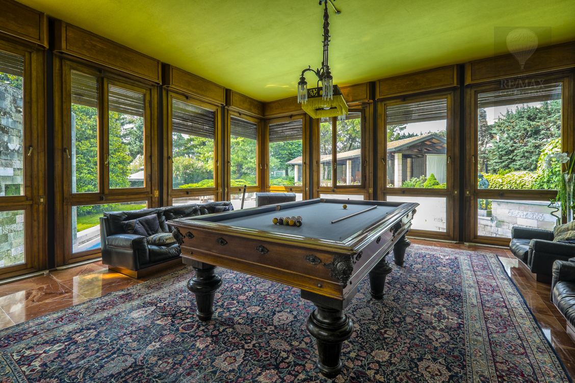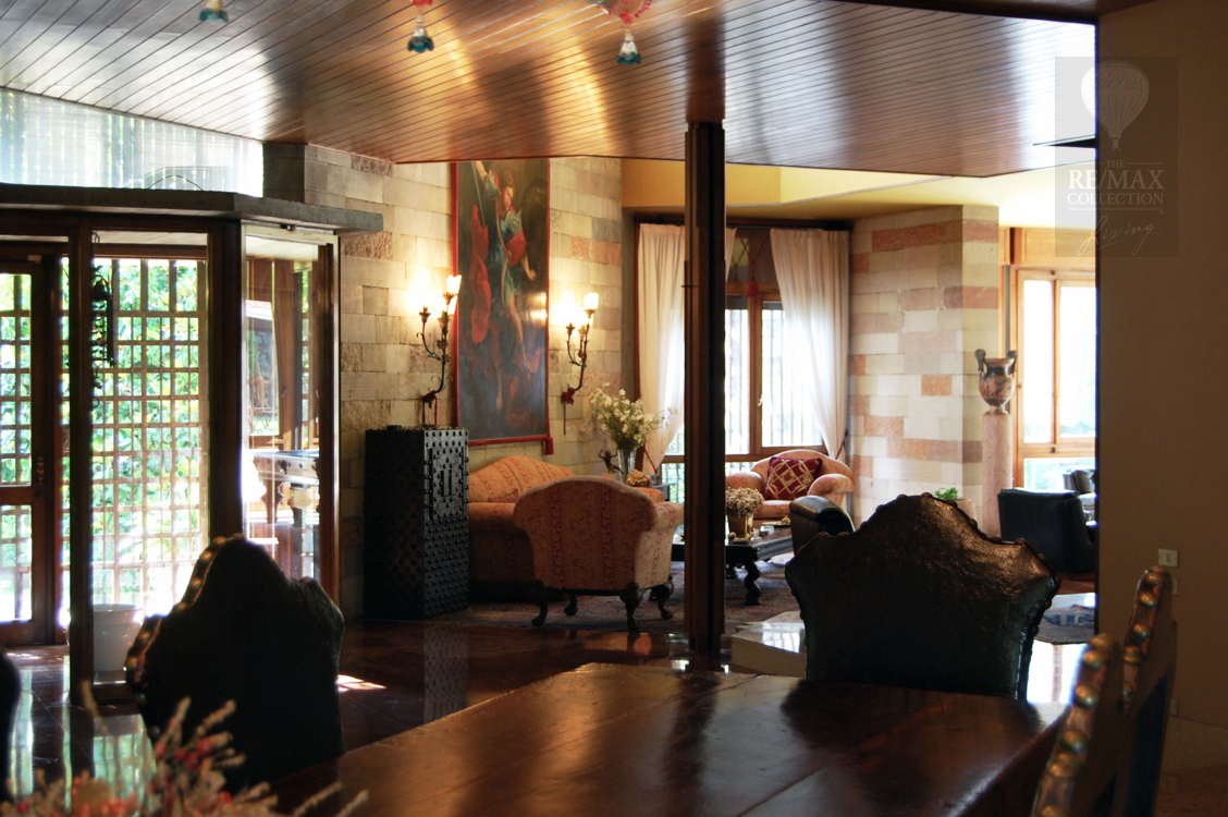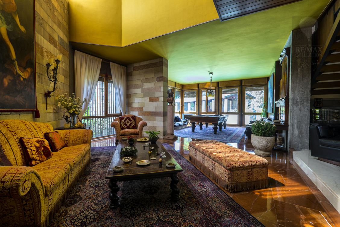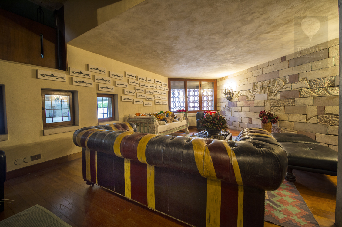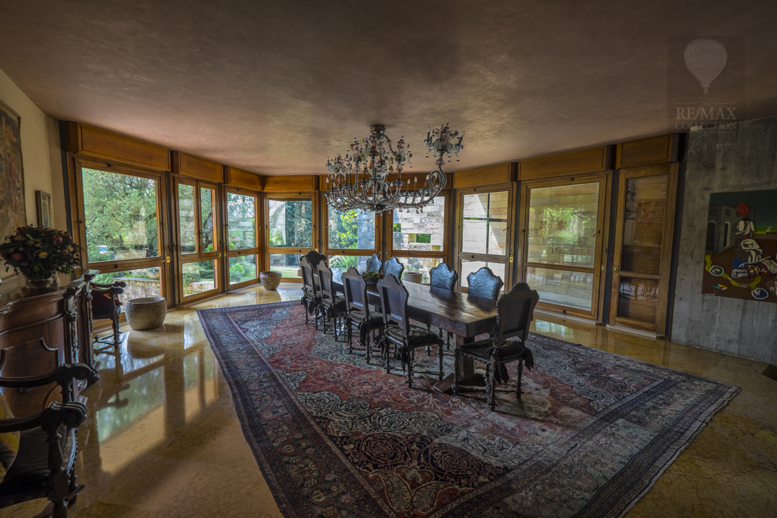 Die geräumigen Innenräume im Erdgeschoss stehen in Kontinuität zueinander und werden durch den Kontrast zwischen dem rohen Stein der die extrem hohen Wände bedeckt und dem eleganten gelb, rot und weißen, spiegelpolierten Marmorboden gekennzeichnet. Die beeindruckende zentrale Halle ist ein verbindendes Element zwischen allen Bereichen des Erdgeschosses - Wohnzimmer, Esszimmer, Billardzimmer, Bibliothek, Fernsehraum und Fitnessbereich, Räume, in denen Sie zu verschiedenen Zeitpunkten des Tages bequem leben und sich entspannen können. Tradition und Technik leben in der Küche zusammen.Der riesige Kamin und die moderne Ausstattung mit elektrischen Haushaltsgeräten machen den Ort familiär und gemütlich, aber gleichzeitig praktisch und funktional.