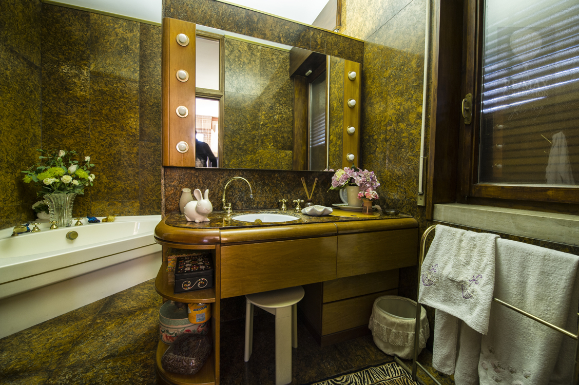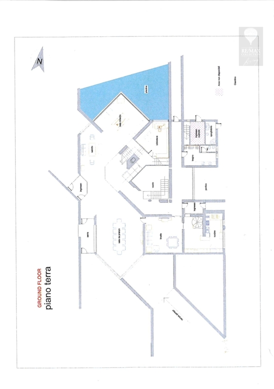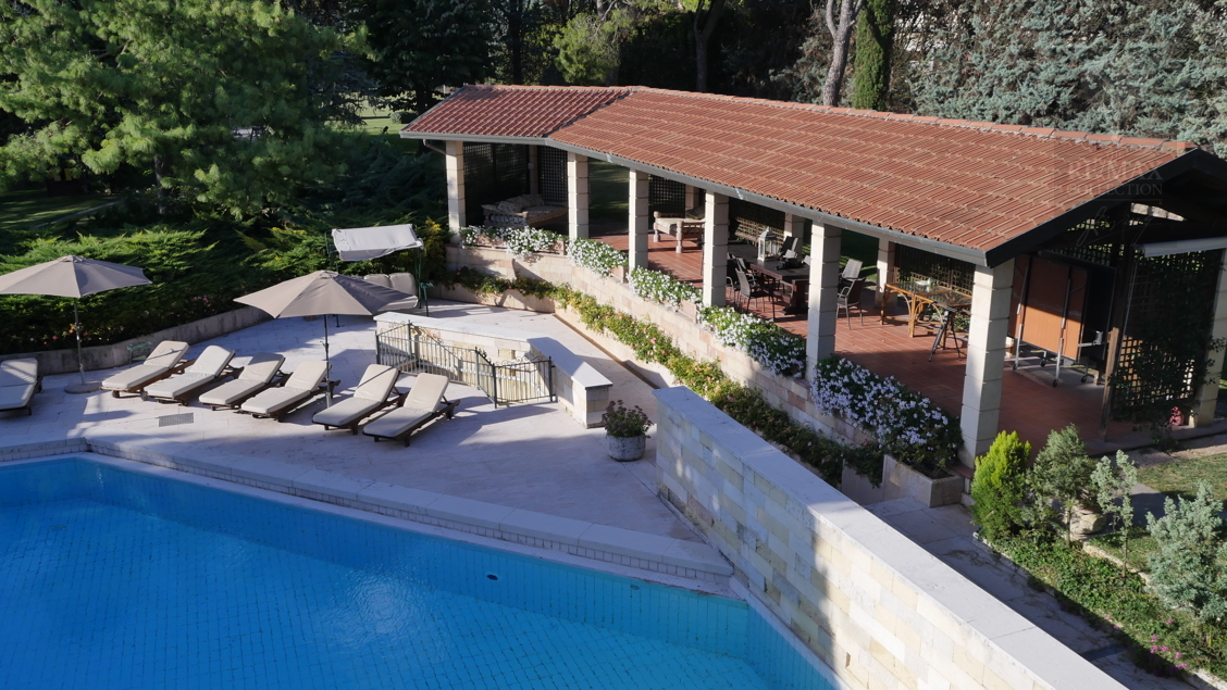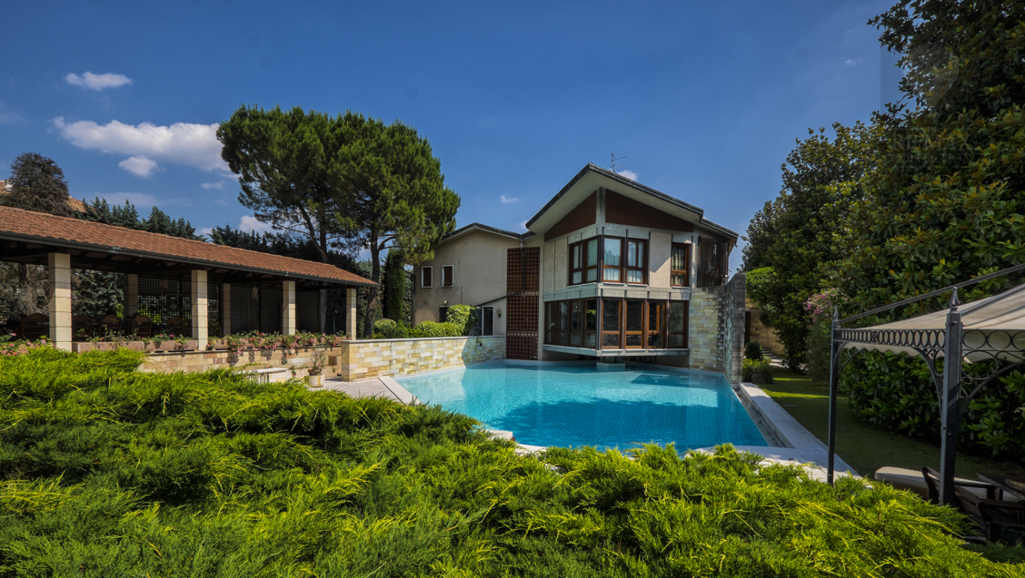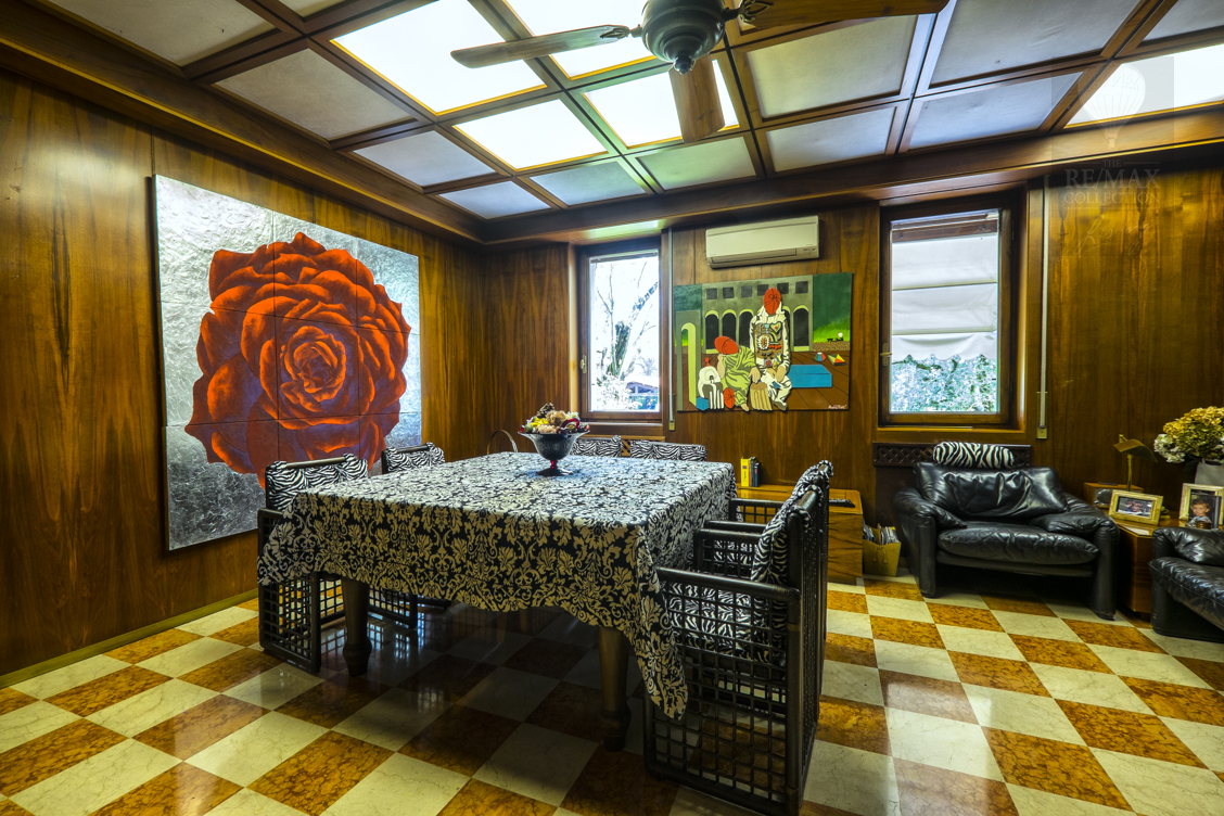 Die geräumigen Innenräume im Erdgeschoss stehen in Kontinuität zueinander und werden durch den Kontrast zwischen dem rohen Stein der die extrem hohen Wände bedeckt und dem eleganten gelb, rot und weißen, spiegelpolierten Marmorboden gekennzeichnet. Die beeindruckende zentrale Halle ist ein verbindendes Element zwischen allen Bereichen des Erdgeschosses - Wohnzimmer, Esszimmer, Billardzimmer, Bibliothek, Fernsehraum und Fitnessbereich, Räume, in denen Sie zu verschiedenen Zeitpunkten des Tages bequem leben und sich entspannen können. Tradition und Technik leben in der Küche zusammen.Der riesige Kamin und die moderne Ausstattung mit elektrischen Haushaltsgeräten machen den Ort familiär und gemütlich, aber gleichzeitig praktisch und funktional.