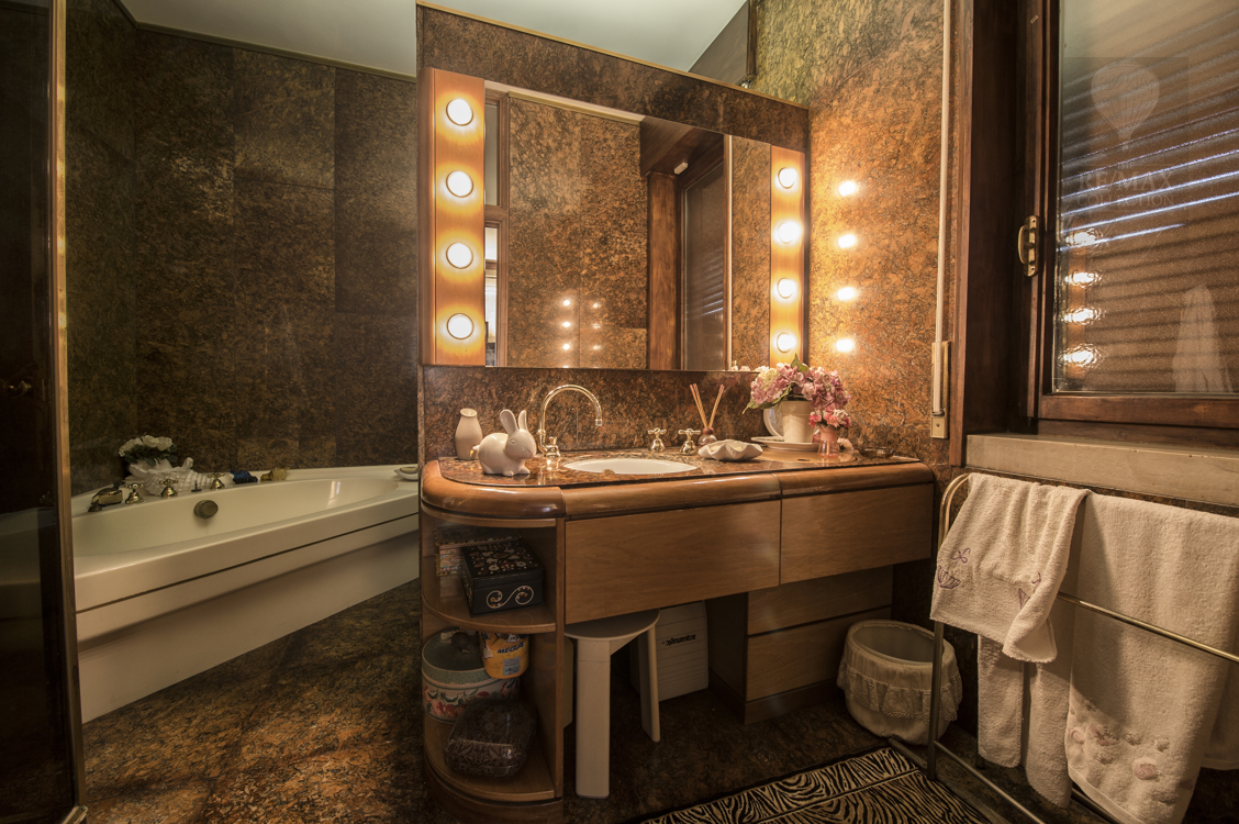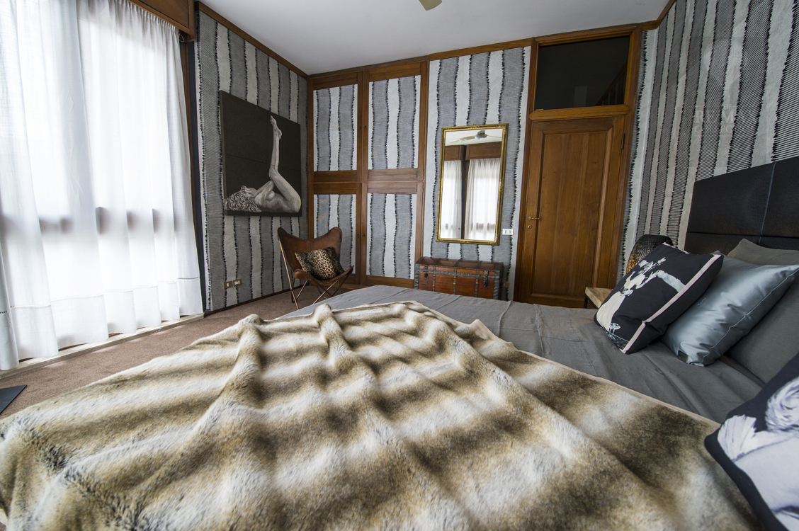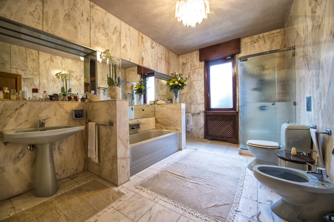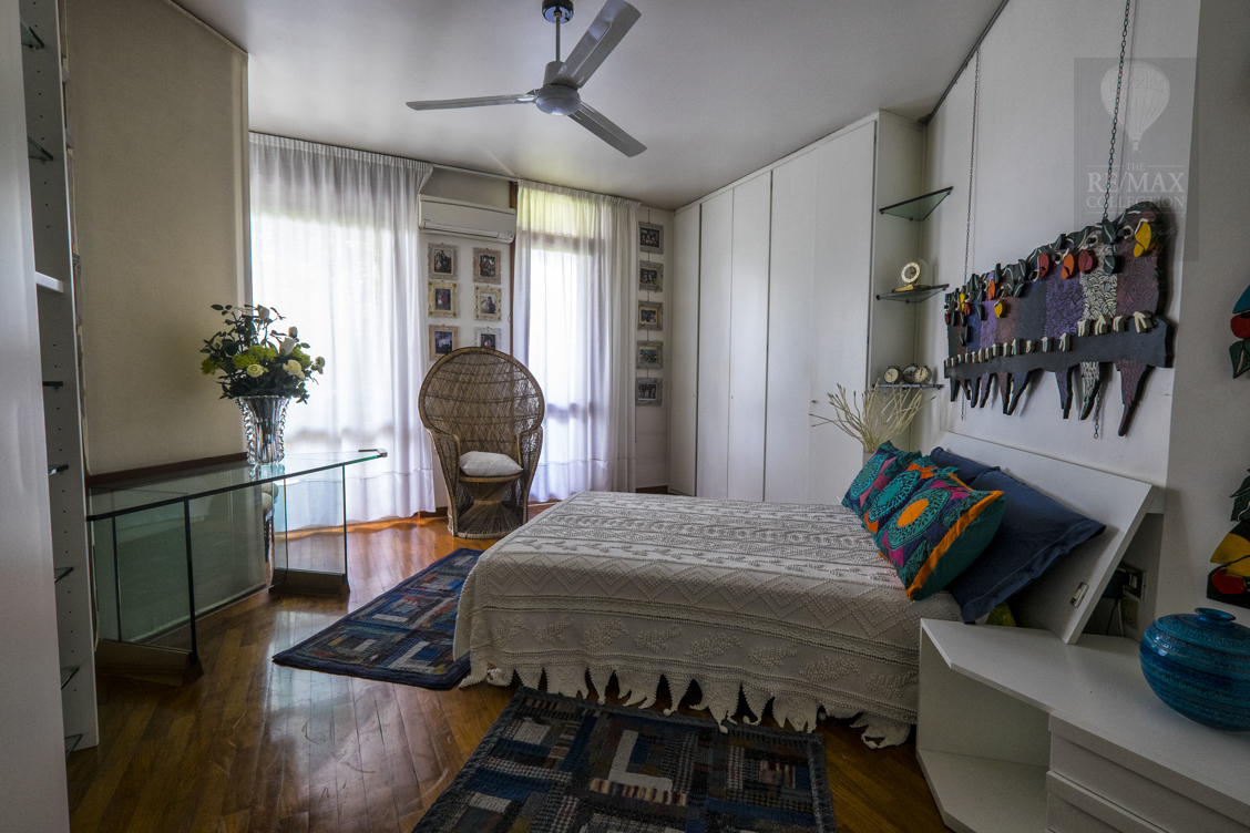 Der Schlafbereich in der ersten Etage der Villa ist über zwei große Treppenaufgänge, suspendiert über dem großen zentralen Innenraum, zu erreichen. Der eine ist aus Marmor und der andere aus Stahl und Holz. Die fünf kürzlich renovierten Schlafzimmer sind geräumig, klimatisiert und raffiniert in verschiedenen Stilen von großen internationalen Designern eingerichtet. Die Badezimmer sind geräumig und hell, mit feinen Oberflächen von rosafarbenem Marmor, rotem argentinischen Granit und italienischer Perlmutt-Keramik. Alle sind mit Duschkabinen und Badewannen ausgestattet. In der finnischen Sauna können die Liebhaber des Wohlbefindens intensive Momente der Entspannung erleben.