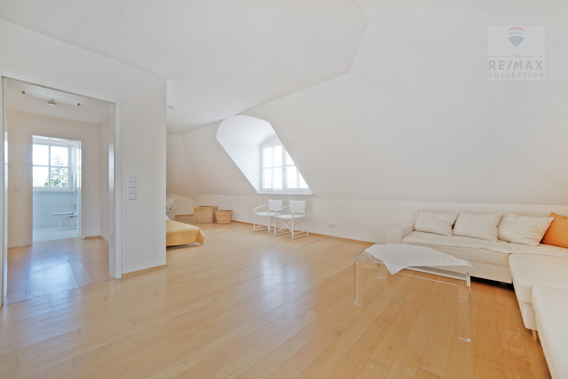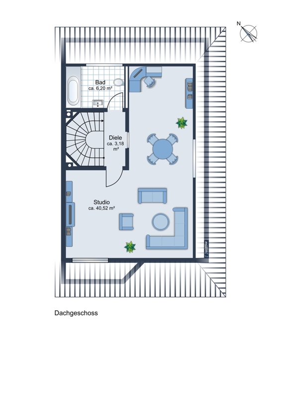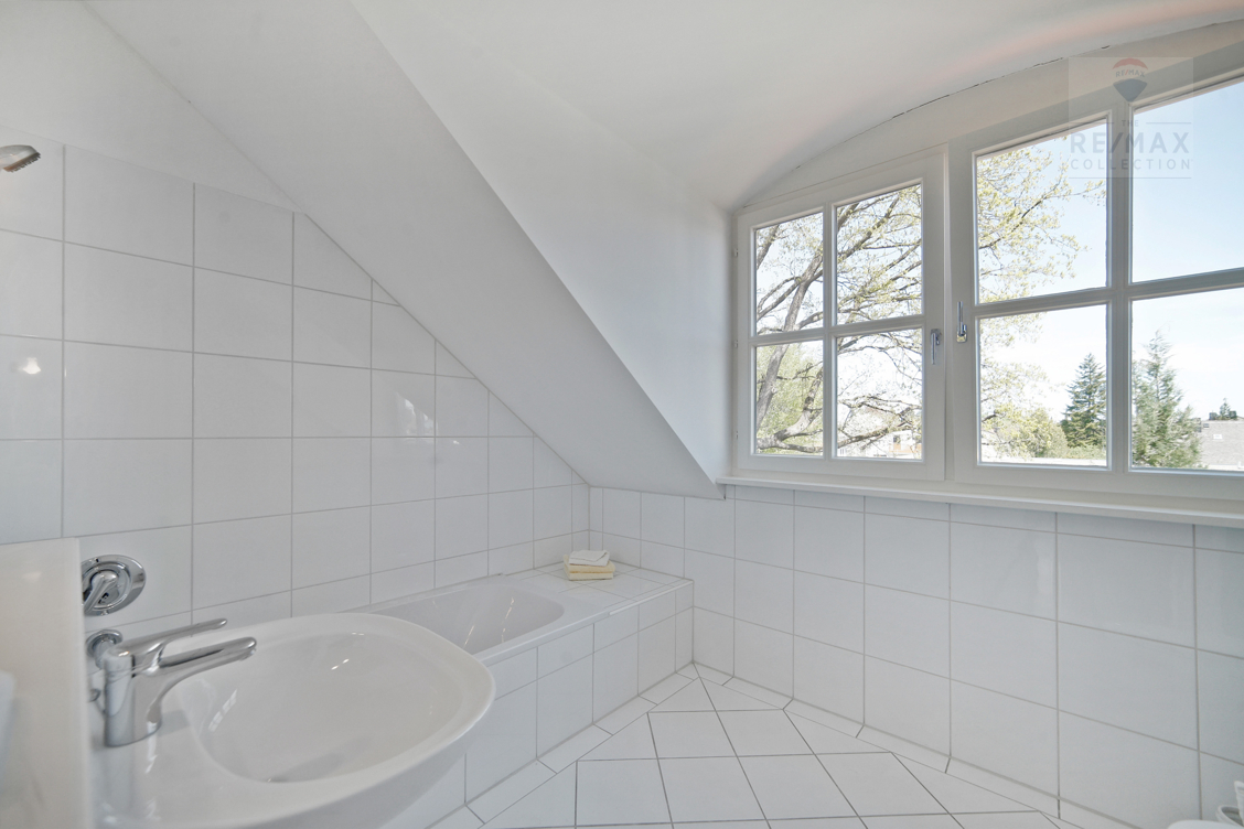 Das Dachgeschoss bietet ein ca. 41 m² großes Studio mit Dachgauben, welches vielseitig genutzt werden kann. Optional kann dieses Studio in zwei Zimmer mit zwei Heizkreisen aufgeteilt werden, sodass hier zwei weitere Schlafzimmer, Arbeitszimmer, etc. geschaffen werden können (nicht statisch oder durch einen Architekten geprüft). Im Dachgeschoss finden Sie ebenfalls ein weiteres weiß gefliestes Badezimmer mit Badewanne und Dachgaube.