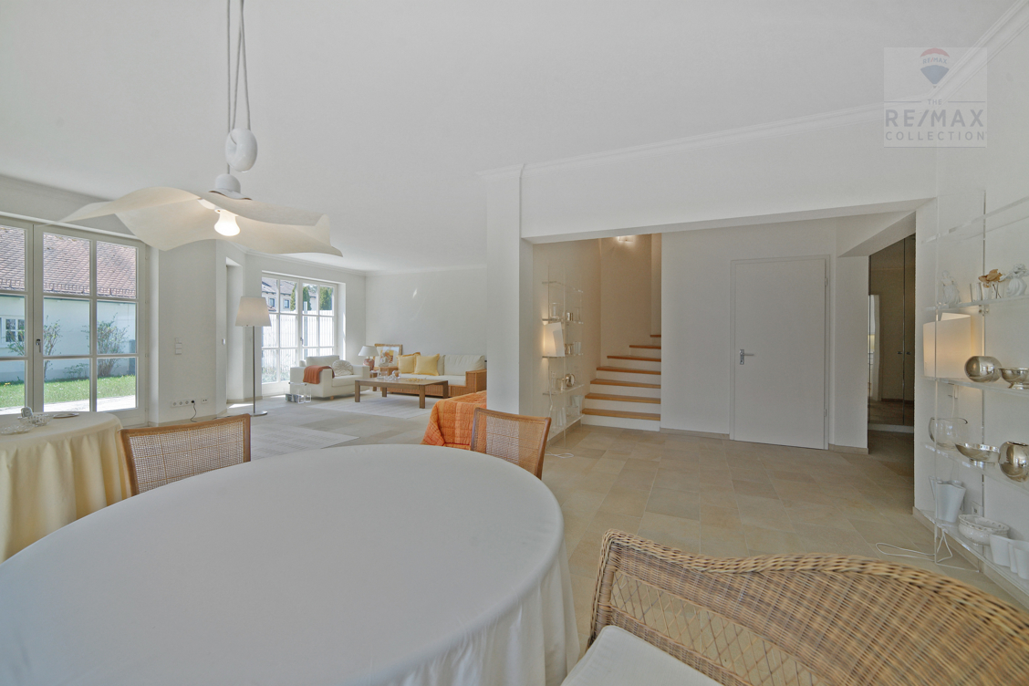 Von der Einfahrt aus gelangt man in den einladenden Süd-West Vorgarten mit Terrasse und Sitzmöglichkeit. Der Eingangsbereich mit weiß gefliestem Gäste-WC bietet Ihnen Zugang zum großzügigen Dielenbereich mit Einbauschrank. Von hier aus erreichen Sie den offenen und sehr hellen Wohn- und Essbereich, mit einer großflächigen Fensterfront und Blick sowie Zugang zur Terrasse und zum Garten. Der Wohn- und Essbereich kann problemlos in den eingewachsenen und uneinsehbaren Garten verlagert werden, sodass Sie bereits morgens die ersten Sonnenstrahlen genießen können. Die maßangefertigte Küche (ca. 25 Jahre alt) befindet sich ebenfalls im Erdgeschoss und ist mit einer Einbauküche und Einbaugeräten von Gaggenau, Imperial, Miele, etc. ausgestattet (nicht im Kaufpreis enthalten). Die Küche ist von der Diele und ebenfalls vom Essbereich durch ein Seisenberger Schiebetürsystem (weiß, Holz) zu erreichen.