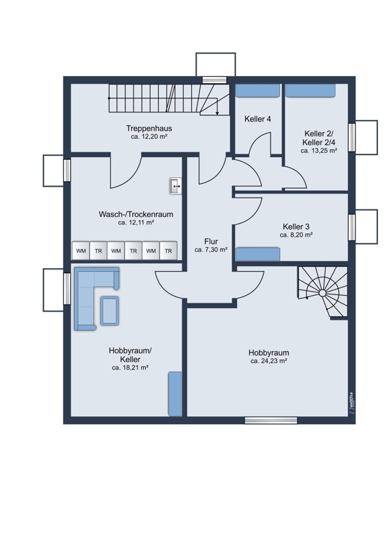 Den Mietern stehen 3 Einzelgaragen sowie 3 Stellplätze zur Verfügung, weiterhin Kellerräume/-abteile in Vorderhaus und Rückgebäude, im Rückgebäude ist zusätzlich ein Waschkeller für die Mieter dieses Hausteils vorhanden mit Plätzen für Waschmaschine und Trockner je Partei des RGB.