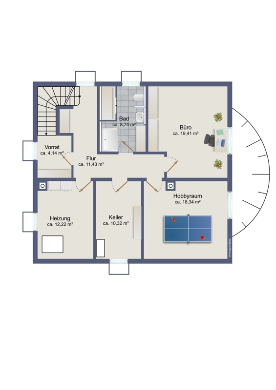 + Raumhöhe im EG Spitzbogen bis 4,5 m, im UG - 2,45 m