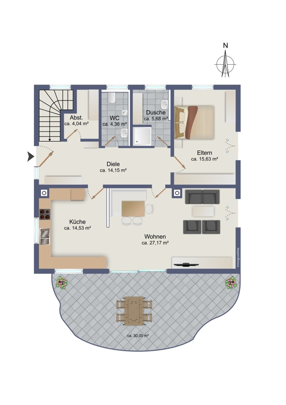 + Tageslichtbad im EG mit Dusche und WM-Anschluss sowie separates WC
