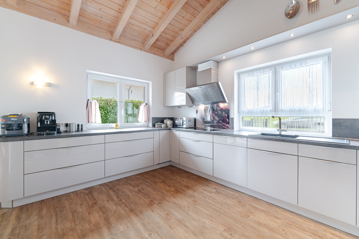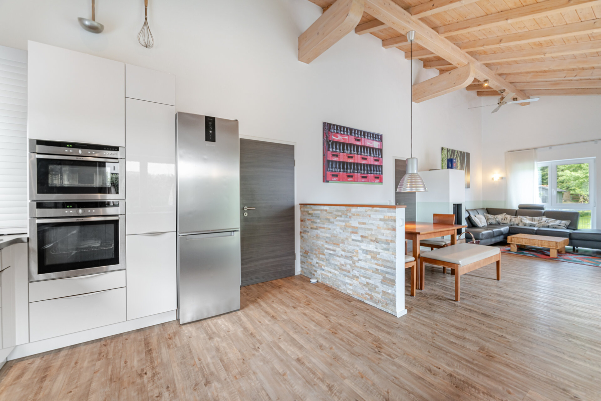 Dieses moderne Einfamilienhaus, erbaut im Jahr 2012, bietet auf einer Gesamtfläche von ca. 200 m² ein komfortables Zuhause für Familien und Senioren. Auf einem großzügigen Grundstück von 450 m² gelegen, besticht die Immobilie durch ihre außergewöhnliche Planung sowie einer Energieeffizienzklasse A, die für niedrige Energiekosten und umweltfreundliches Wohnen sorgt.Beim Betreten des Hauses empfängt Sie ein einladender Eingangsbereich, der direkt in den offenen Wohn- und Essbereich führt. Große Fensterfronten sorgen für viel Tageslicht und schaffen eine angenehme Wohnatmosphäre. Ein Kaminofen sorgt hier für gemütliche Abende und zusätzliche Wärme. Die angrenzende - gut ausgestattete Küche - ist modern gestaltet und bietet ausreichend Platz für gemeinsame Kochabende mit Familie oder Freunden.