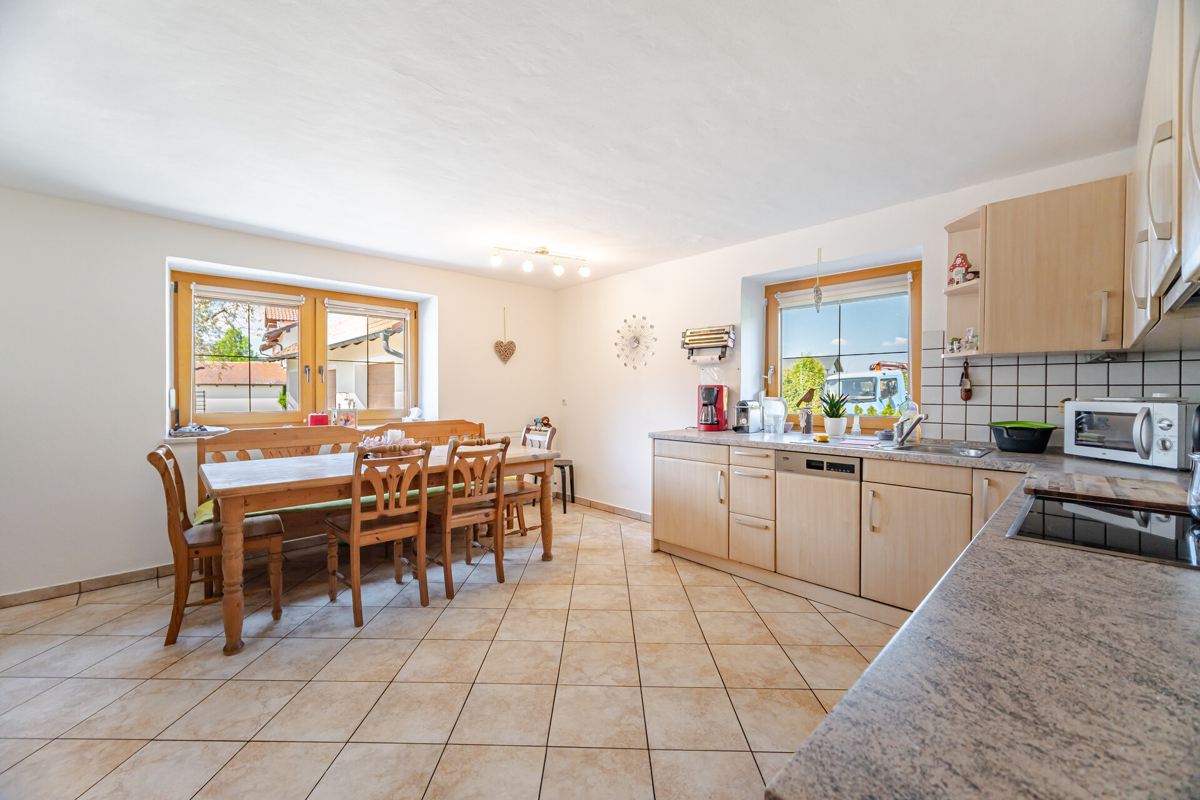 Ölzentralheizung, Kachelofen, Einbauküche.