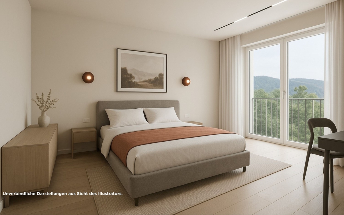 Die dargestellten Grundrisse und Angaben entsprechen dem Stand der Eingabeplanung. Im Rahmen der Ausführungs- und Detailplanung können aufgrund bautechnischer Erfordernisse oder behördlicher Auflagen Änderungen gegenüber dieser Planung möglich sein. Für die Ausstattung ist die Baubeschreibung maßgebend. Dargestellte Möbel und Einbauten sind beispielhaft. Die Grundrisse sind nicht zur Maßnahme für die Möblierung geeignet. Die zeichnerische Darstellung der Perspektiven und Fassaden sowie deren Farbgestaltung geben
