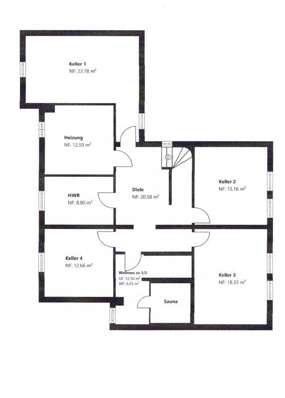 Im Kellergeschoss gibt es vier größere Keller-Hobbyräume (jeweils mit Fenster), einen Hauswirtschaftsraum sowie eine Sauna mit großzügigem Duschbereich.