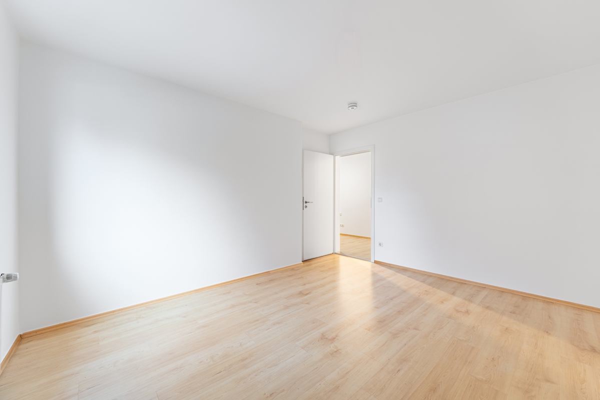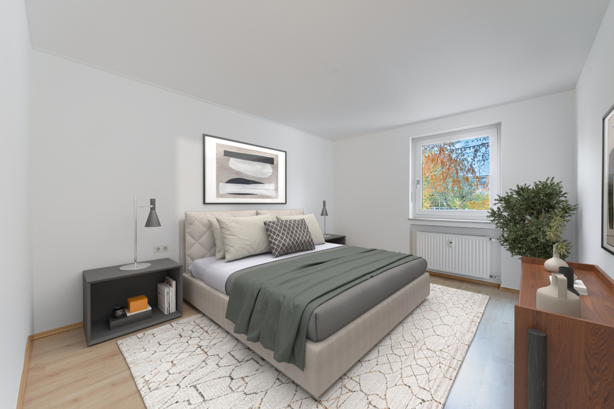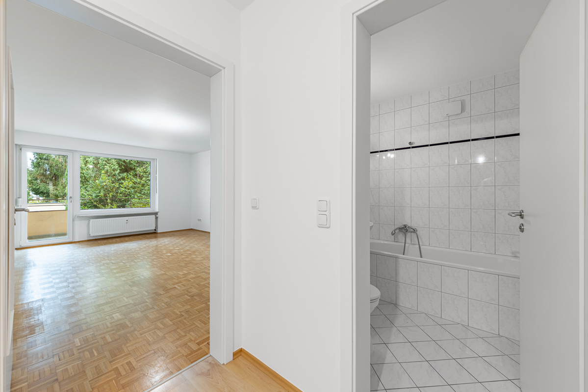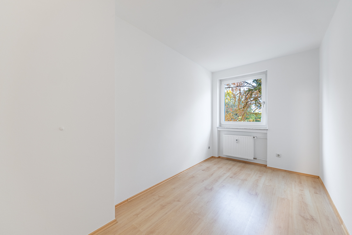 Hier sorgt eine große Fensterfront für viel Tageslicht und bietet Zugang zum Balkon, der einen herrlichen Blick ins Grüne ermöglicht.