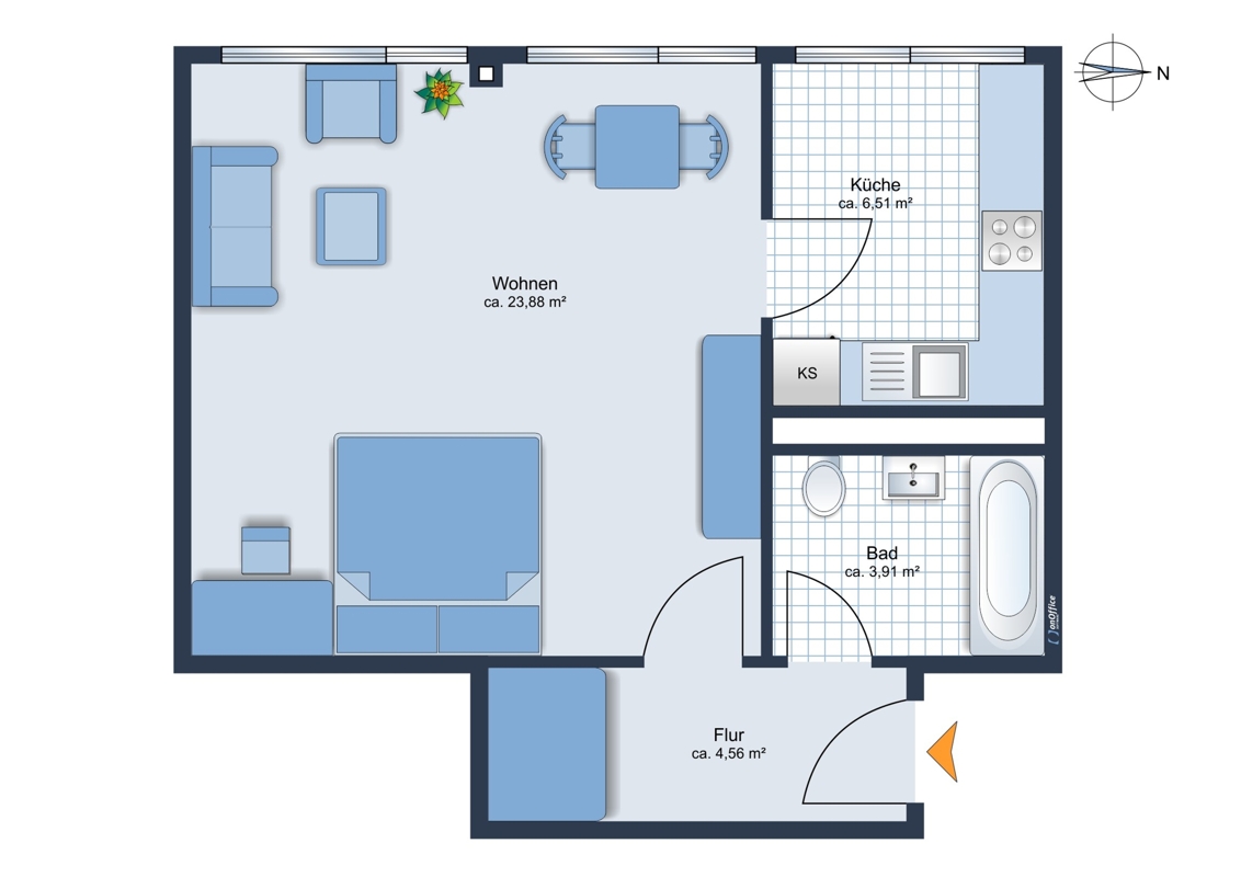 - Wohnfläche: ca. 38,86 m²- 6. Obergeschoss (insgesamt 8) mit Aufzug