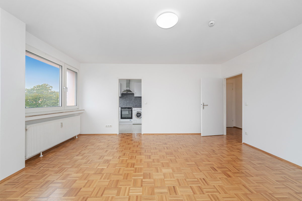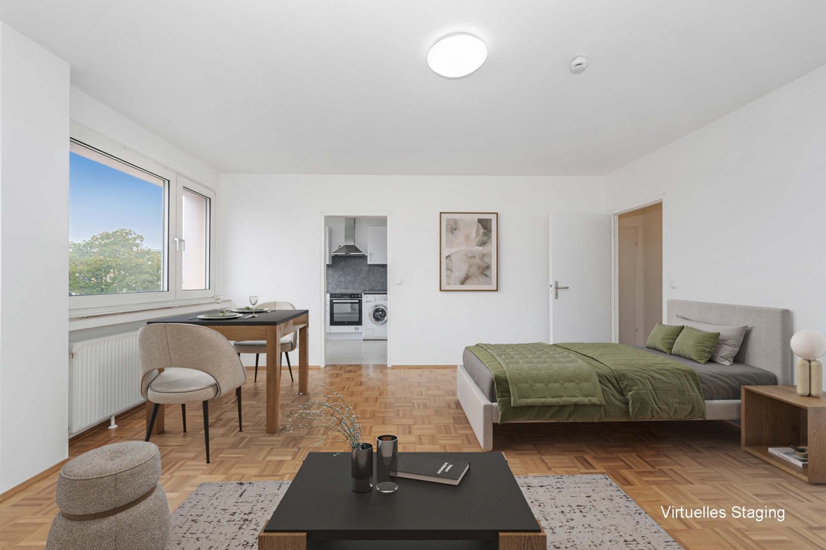 Charmantes Apartment im 6. Obergeschoss mit hochwertigem Parkettboden und Blick ins Grüne. Ruhige Lage in München-Neuperlach, umfassende Renovierungen in 2014, frisch gestrichen (09/2025), mit Aufzug, Kellerabteil und Tiefgaragen-Einzelstellplatz – sofort bezugsfrei.Diese gepflegte 1-Zimmer-Wohnung befindet sich im 6. Obergeschoss eines 1969 erbauten Mehrparteienhauses in 81735 München-Neuperlach.