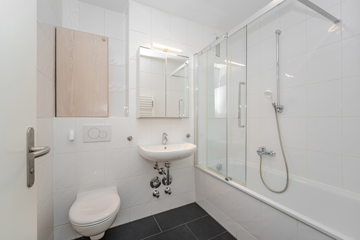 - Badezimmer mit Duschwanne, WC und Waschbecken
