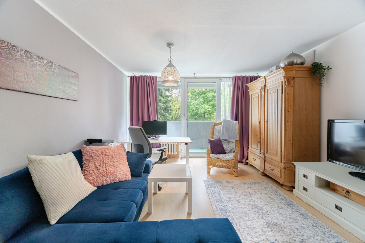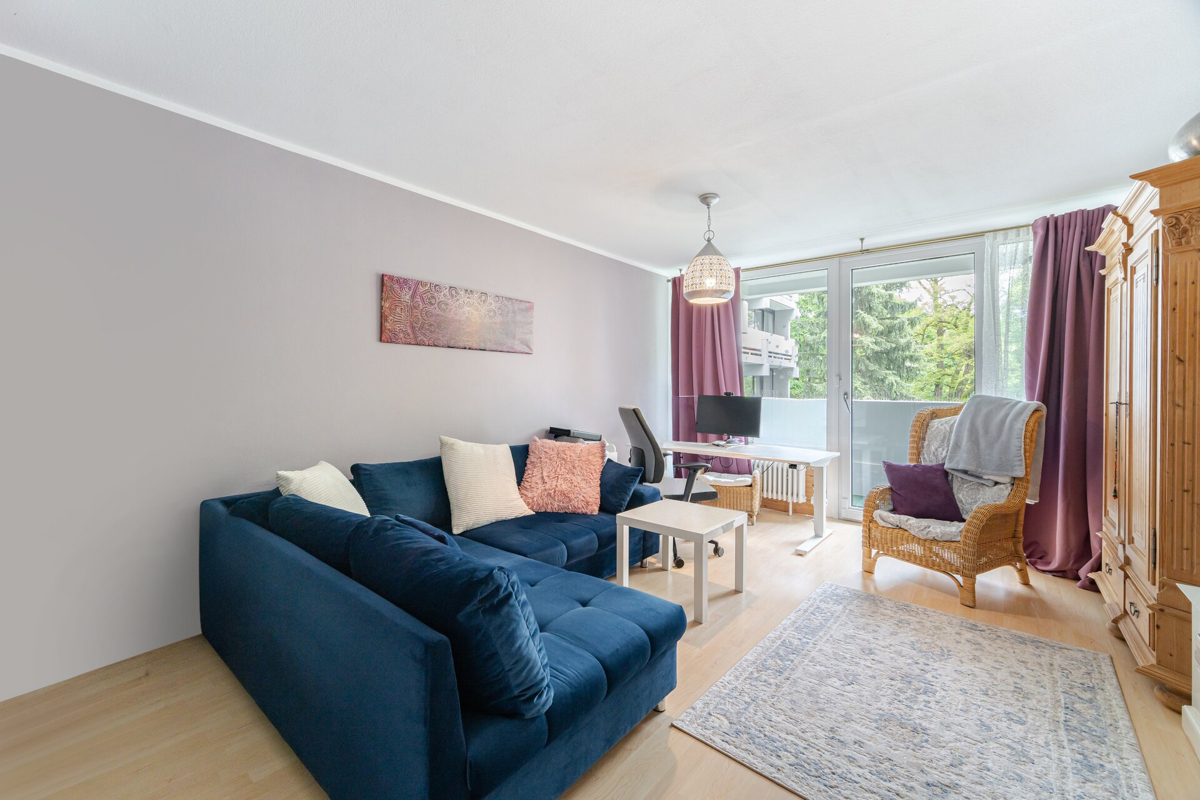 Das Herzstück der Wohnung ist das helle, geräumige Wohnzimmer. Es dient als zentraler Treffpunkt und bietet viel Raum für Entspannung und Geselligkeit. Vom Wohnzimmer aus gelangen Sie direkt auf den Süd-Balkon, der mit einem herrlichen Blick ins Grüne begeistert. Dieser Außenbereich lädt dazu ein, die frische Luft zu genießen, den Tag mit einem Kaffee zu beginnen oder den Abend bei einem Glas Wein ausklingen zu lassen.