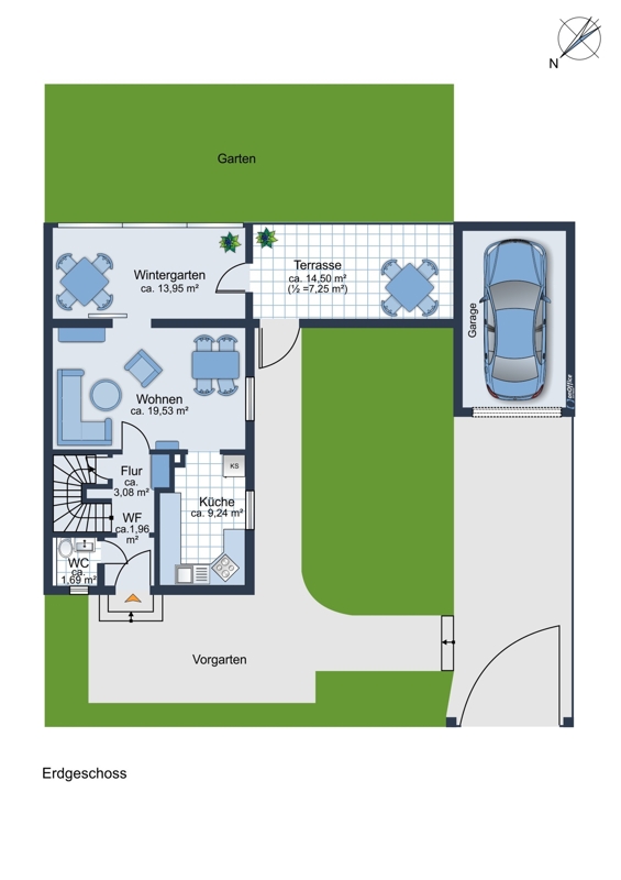 Im Erdgeschoss erwarten Sie ein freundlicher Eingangsbereich, ein Gäste-WC, ein gemütliches Wohnzimmer sowie eine geräumige Küche mit Fenster. Highlight ist der lichtdurchflutete Wintergarten. Mit Fliesenboden, Fußbodenheizung und einem Kamin ausgestattet, schafft er ein behagliches Ambiente und erweitert den Wohnraum auf stilvolle Weise mit herrlichem Blick in den weitläufigen Garten.