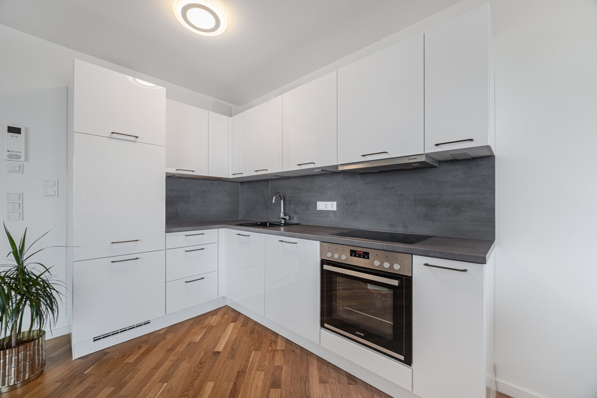 Diese attraktive, neuwertige Wohnung in der sechsten Etage eines architektonisch eleganten Neubaus aus dem Jahre 2021 besticht durch eine ruhige Lage und einen atemberaubenden Weitblick. An schönen Tagen können Sie von der nach Südosten ausgerichteten Loggia den Blick auf die Alpen genießen.Die Wohnung wurde von der Eigentümerin durch eine hochwertige Einbauküche mit modernen Elektrogeräten aufgewertet. Ein dunkler Eichenparkettboden erstreckt sich durch die gesamte Wohnung und verleiht ihr eine elegante Note. Hochwertige Einbauschränke im Flur und Schlafzimmer sowie ein modernes Badezimmer mit bodengleicher Dusche und ausreichend Platz für Waschmaschine und Trockner bieten Ihnen zusätzlichen Wohnkomfort.