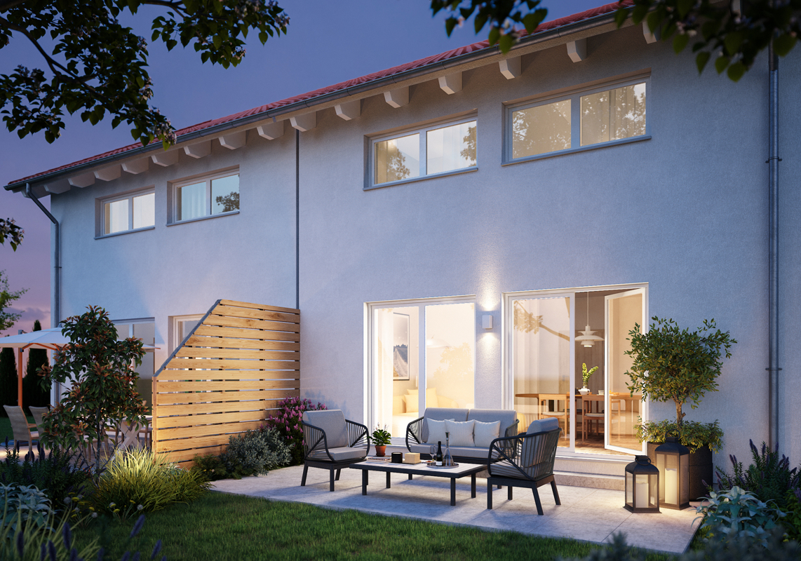 In naturnaher und ruhiger Lage von Unterschleißheim-Riedmoos entsteht diese moderne Neubau-Doppelhaushälfte – ein Zuhause, das mit Klarheit, Licht und Geborgenheit begeistert. Auf rund 103 m² Wohnfläche entfaltet sich ein durchdachtes Wohnkonzept, das den Alltag erleichtert und Raum für individuelle Lebensentwürfe bietet. Mittelpunkt des Hauses ist der großzügige Wohn- und Essbereich mit direktem Zugang auf die Terrasse und in den sonnigen Garten – ideal für entspannte Stunden im Freien, Familienessen oder gemütliche Abende mit Freunden. Drei helle Schlafzimmer im Obergeschoss schenken Rückzugsorte für jedes Alter und jeden Lebensstil. Im Speicher stehen praktische Abstellmöglichkeiten zur Verfügung – ein Plus, das im Alltag für Ordnung und Leichtigkeit sorgt.Die Architektur ist modern und klar, der Schnitt funktional und durchdacht. Große, teils bodentiefe Fenster öffnen den Blick nach draußen, lassen viel Tageslicht herein und machen das Zuhause zum Wohlfühlort. Besonders hervorzuheben ist die Ausrichtung des Gartens nach Süden und Osten – der perfekte Ort, um die Sonne zu genießen und zur Ruhe zu kommen.