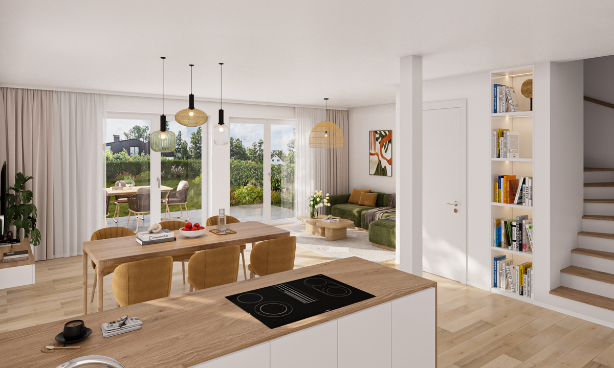 In naturnaher und ruhiger Lage von Unterschleißheim-Riedmoos entsteht diese moderne Neubau-Doppelhaushälfte – ein Zuhause, das mit Klarheit, Licht und Geborgenheit begeistert. Auf rund 103 m² Wohnfläche entfaltet sich ein durchdachtes Wohnkonzept, das den Alltag erleichtert und Raum für individuelle Lebensentwürfe bietet. Mittelpunkt des Hauses ist der großzügige Wohn- und Essbereich mit direktem Zugang auf die Terrasse und in den sonnigen Garten – ideal für entspannte Stunden im Freien, Familienessen oder gemütliche Abende mit Freunden. Drei helle Schlafzimmer im Obergeschoss schenken Rückzugsorte für jedes Alter und jeden Lebensstil. Im Speicher stehen praktische Abstellmöglichkeiten zur Verfügung – ein Plus, das im Alltag für Ordnung und Leichtigkeit sorgt.Die Architektur ist modern und klar, der Schnitt funktional und durchdacht. Große, teils bodentiefe Fenster öffnen den Blick nach draußen, lassen viel Tageslicht herein und machen das Zuhause zum Wohlfühlort. Besonders hervorzuheben ist die Ausrichtung des Gartens nach Süden und Westen – der perfekte Ort, um die Sonne zu genießen und zur Ruhe zu kommen.